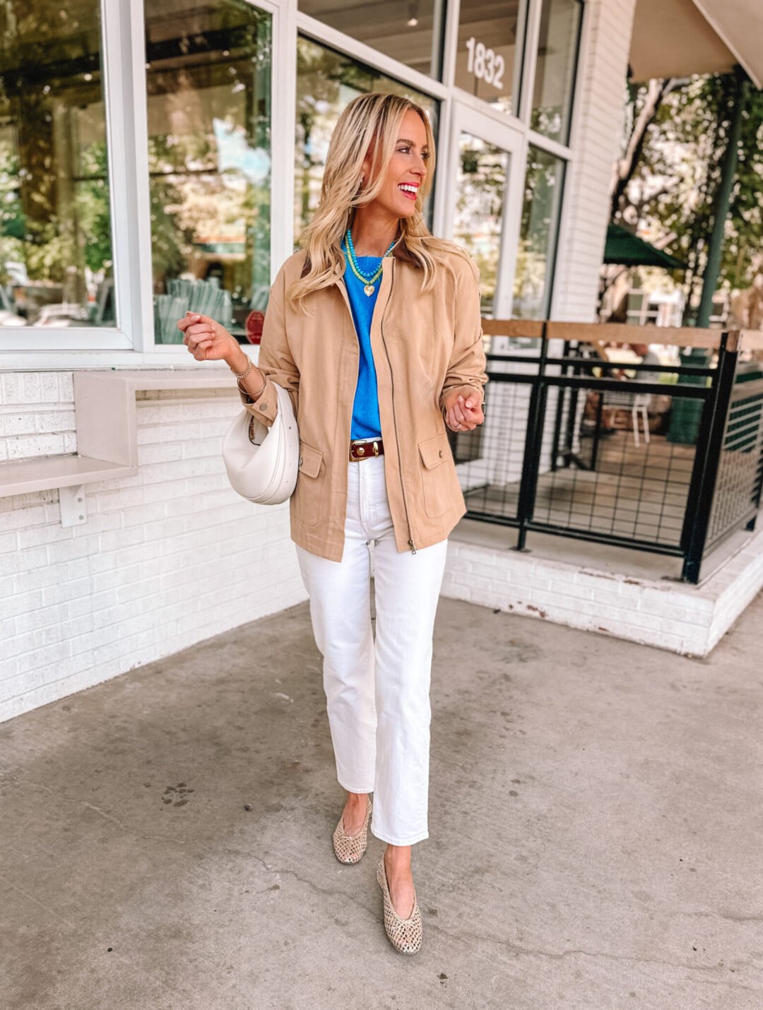 I am absolutely in love with this Amazon short sleeve sweater and barn jacket! It is the perfect early fall outfit. The color on this sweater is amazing!! A short sleeve sweater in this silhouette is really trendy right now, especially tucked all the way in with a belt. I love how it pairs with this barn jacket which is also one of the biggest trends for the season!! I am shocked at how good the quality of this one is for Amazon. It’s fully lined and a great price!! I highly recommend both! I am planning a post with some styling ideas.